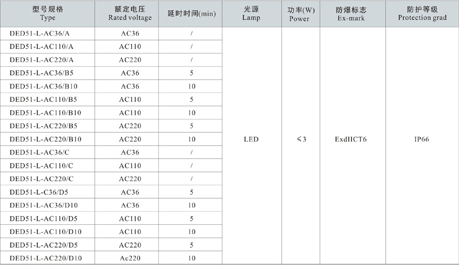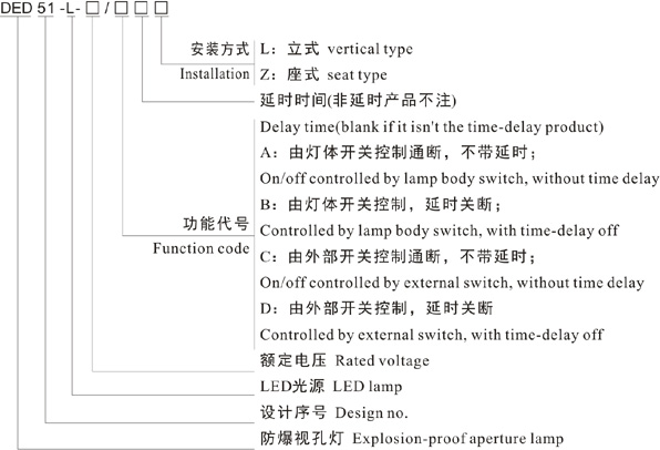2. Please specify clearly for special requirements on rated voltage. e.g: if need a vertically installed DED51-LED explosion-proof inspection hole lamp, rated voltage is AC110, with lamp body switch control, turn off after a delay of 5min, then the order model should be DED51-LED-AC110/B5L.