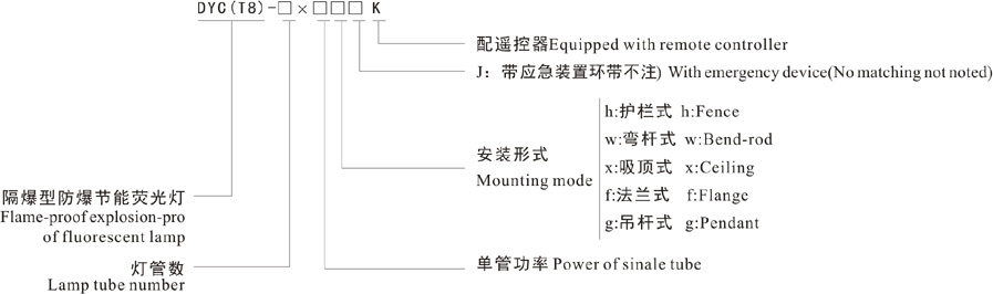 With emergency derice DYC(T8)type flame-proof explosion-proof fluorescent lamp of mounting mode are ceiling and pendant.