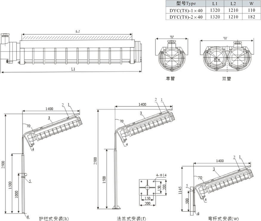 按產(chǎn)品型號說明逐條選擇,例:需要T8節(jié)能燈管2X40W,護欄式安裝,則產(chǎn)品型號為DYC(T8)-2×40h;
