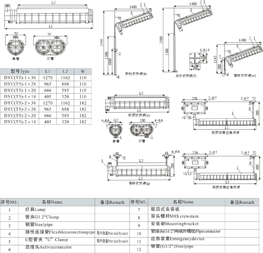 Select item by item according to description of product model,for example,ifyou require hi-pin lamp pipe of2X36W,fence type installation,the product model shall be DYC(T5)-2X36h;