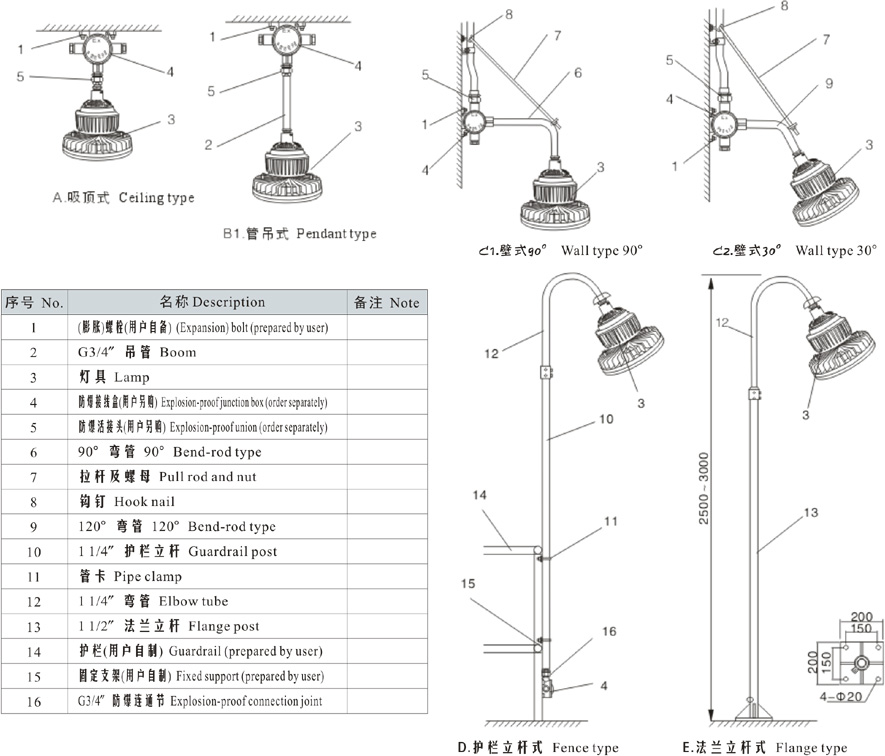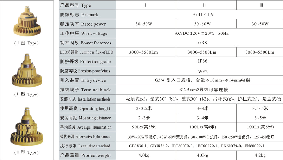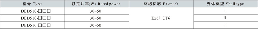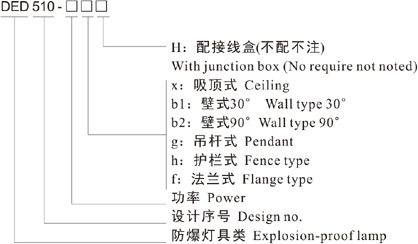 Note: 1. Select according to the product model description, pay attention to marking out the ex-mark;e.g.: Need product of 40W, 220V, pendant type, with junction box,gas explosion-proof, then the model should beDED510-40gH ExdIICT6 Gb;