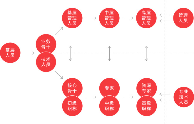 為所有員工提供管理與專業(yè)技術(shù)雙重職業(yè)發(fā)展通道(員工可以通過管理崗位或?qū)I(yè)技術(shù)通道獲得高報酬)。通過任職資格標準牽引、資格認證推動以及培訓平臺支持,不斷幫助員工提升任職能力,使員工逐步勝任更高級別職位,從而實現(xiàn)員工職業(yè)發(fā)展的理想。